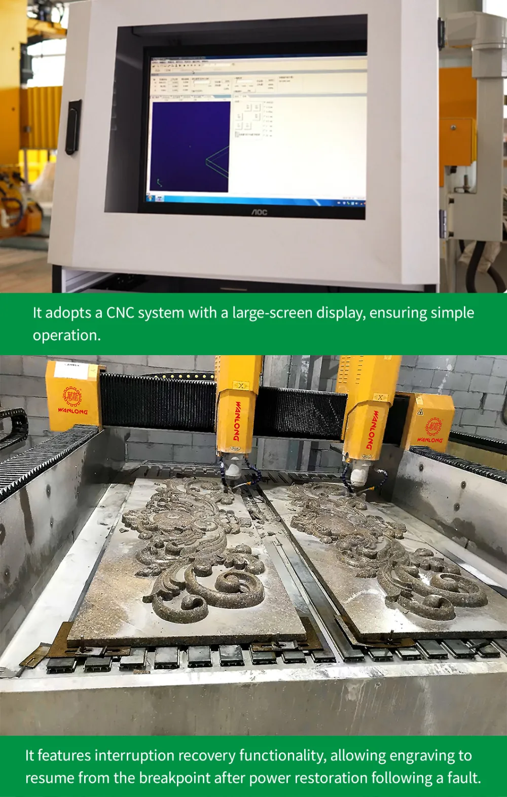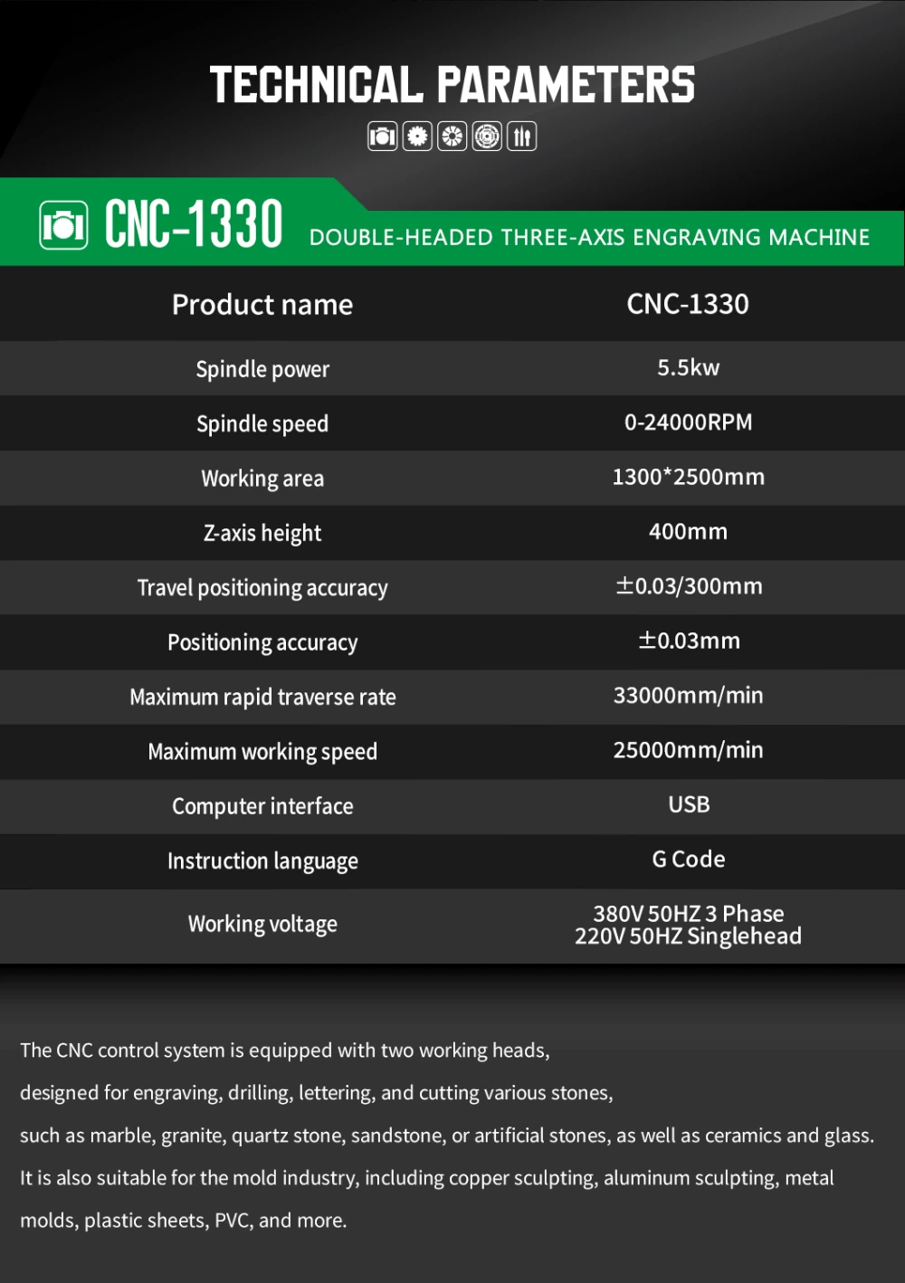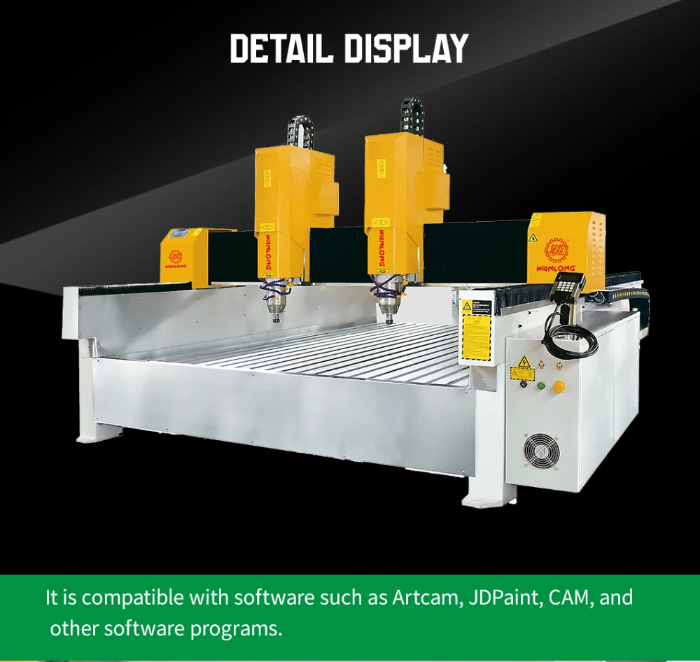 The CNC control system is equipped with two working heads, designed for engraving, drilling, lettering, and cutting various stones, such as marble, granite, quartz stone, sandstone, or artificial stones, as well as ceramics and glass. It is also suitable for the mold industry, including copper sculpting, aluminum sculpting, metal molds, plastic sheets, PVC, and more.